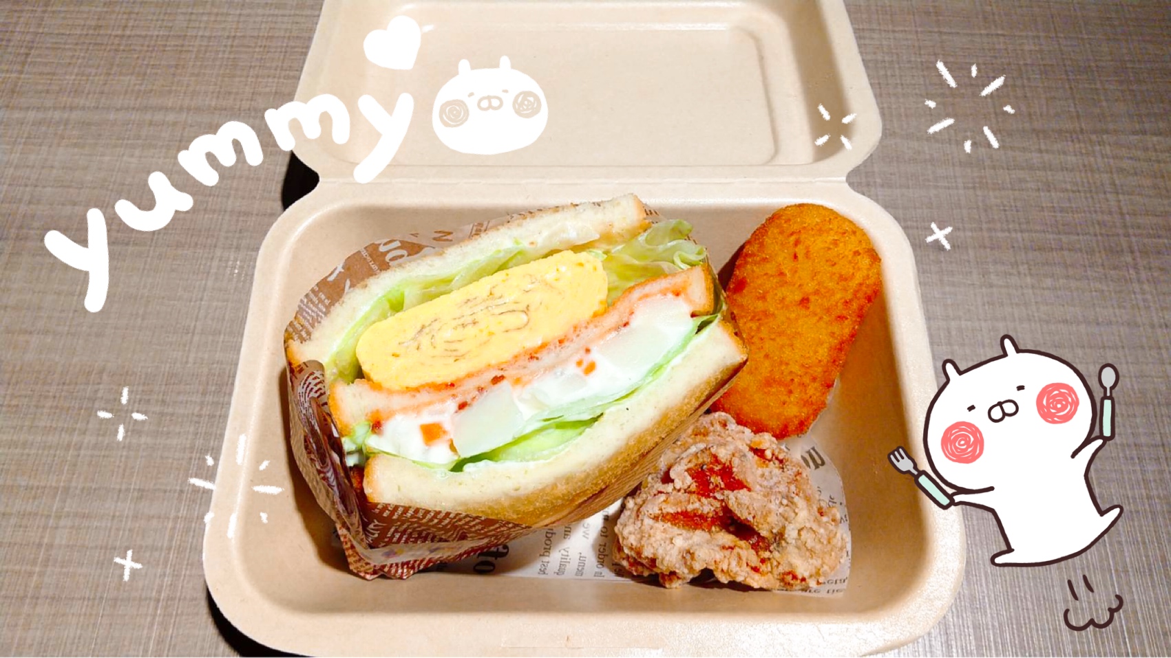 (手作りのだし巻きとポテトサラダのサンドイッチ、唐揚げ、カニクリームコロッケ)