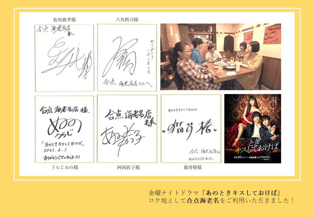 新着情報でも発信していますが、2021年4月30日から6月18日までテレビ朝日系「金曜ナイトドラマ」枠で放送されたテレビドラマ「あのときキスしておけば」の第6話に、合点 海老名店がロケ地として選ばれました٩(ˊᗜˋ*)و